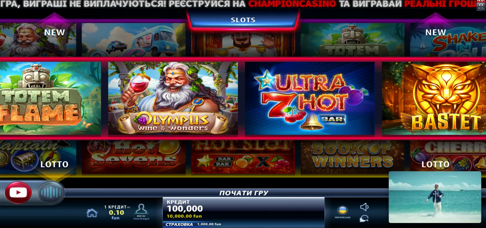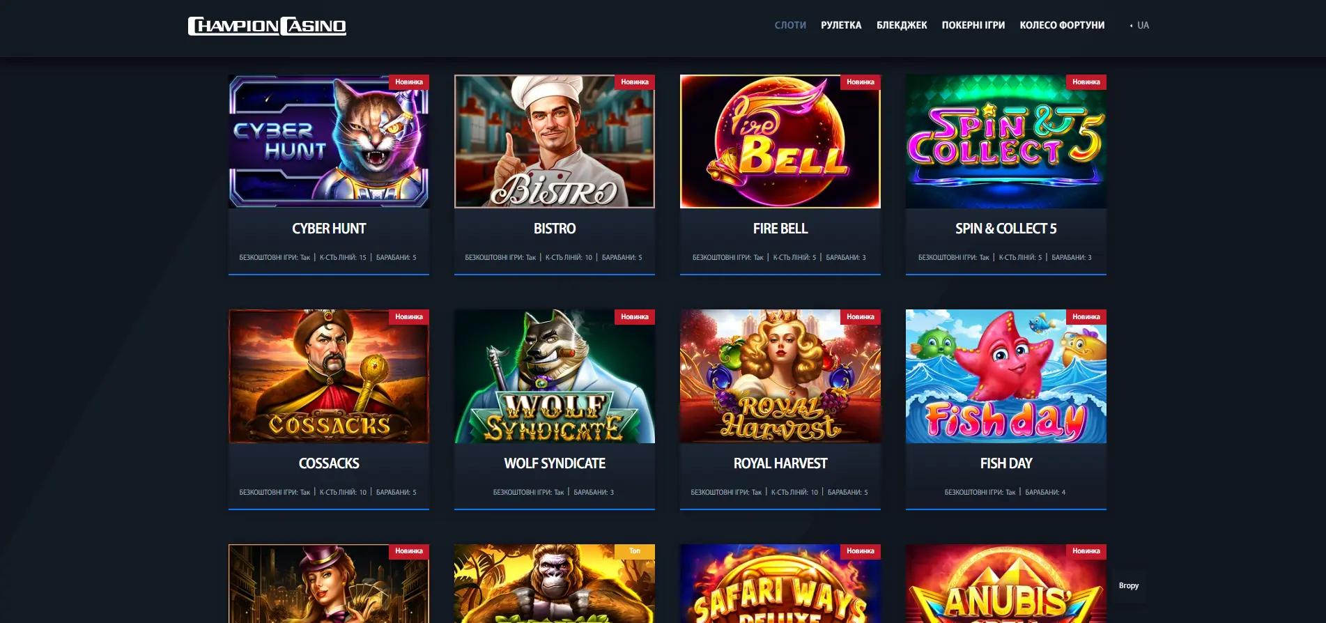 Champion Casino — це сучасна онлайн-платформа для азартних ігор, яка пропонує користувачам широкий вибір розваг: слоти, джекпоти, настільні ігри та live-казино з реальними дилерами. Казино швидко здобуло популярність серед гравців завдяки безпечній системі платежів, зручному інтерфейсу та великій кількості бонусних пропозицій. Тут кожен користувач може швидко створити акаунт, поповнити рахунок та почати грати у будь-який час на ПК або мобільному пристрої, насолоджуючись високоякісною графікою та захопливим ігровим процесом. Сhampion casino гарантує чесність гри, надійний захист особистих даних та зручний доступ до всіх функцій платформи, забезпечуючи комфорт та безпеку кожної сесії для користувачів.